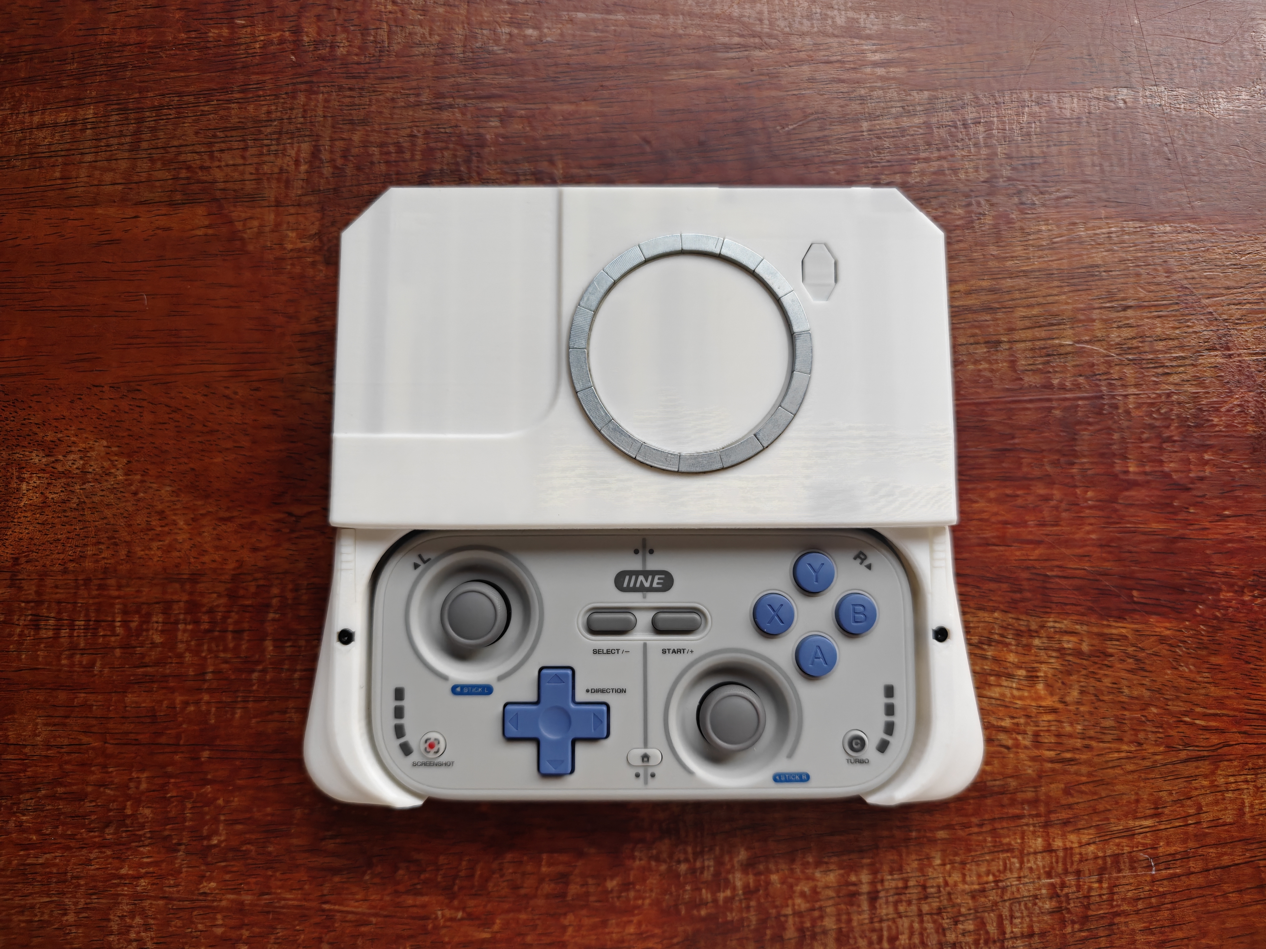 If keep pushing with force, the top panel will be disassembled. The mechanism on the rear of the panel then allows it to extend into a phone stand, enabling the user to place their phone on a table and play games comfortably at a distance.