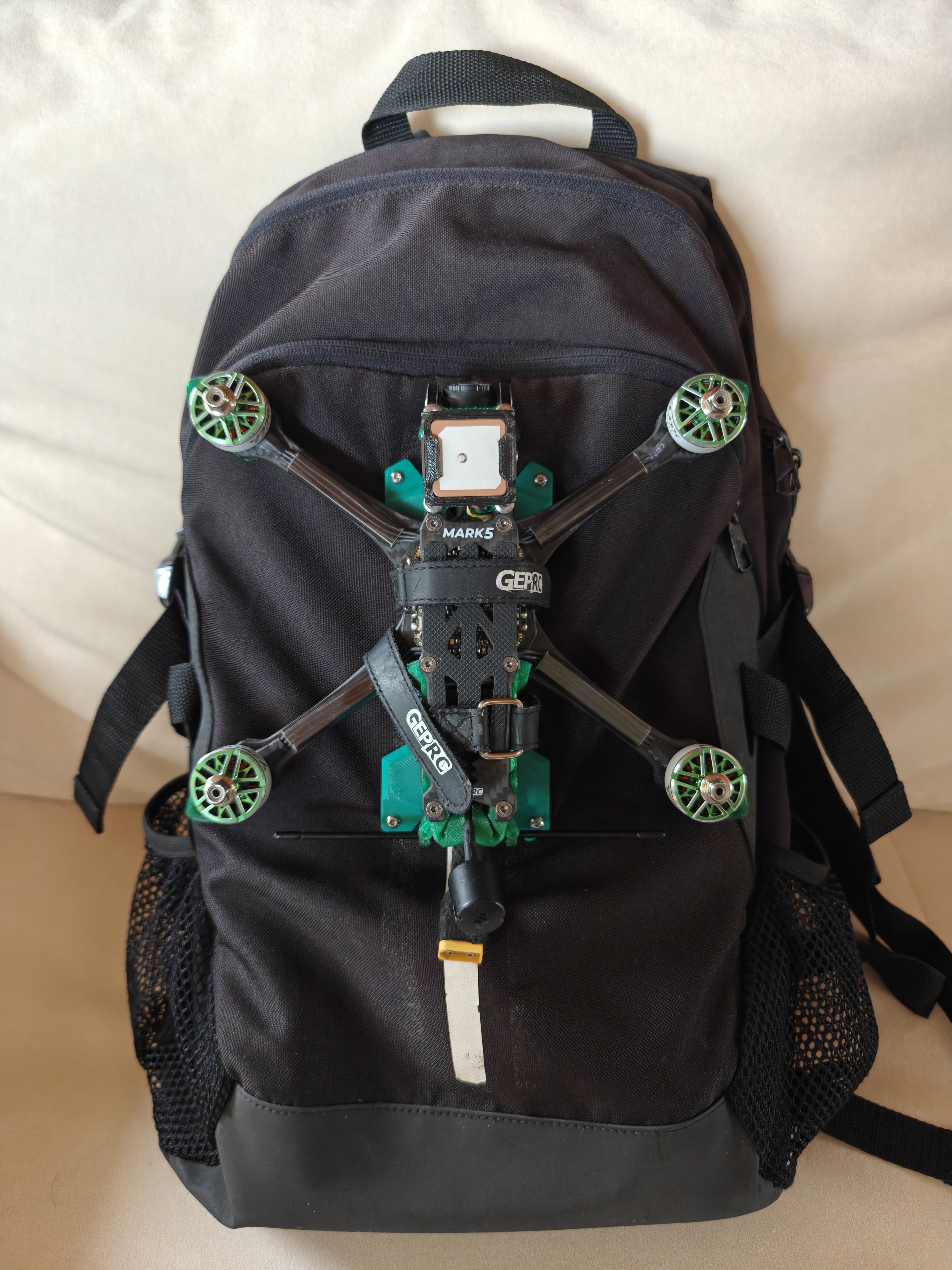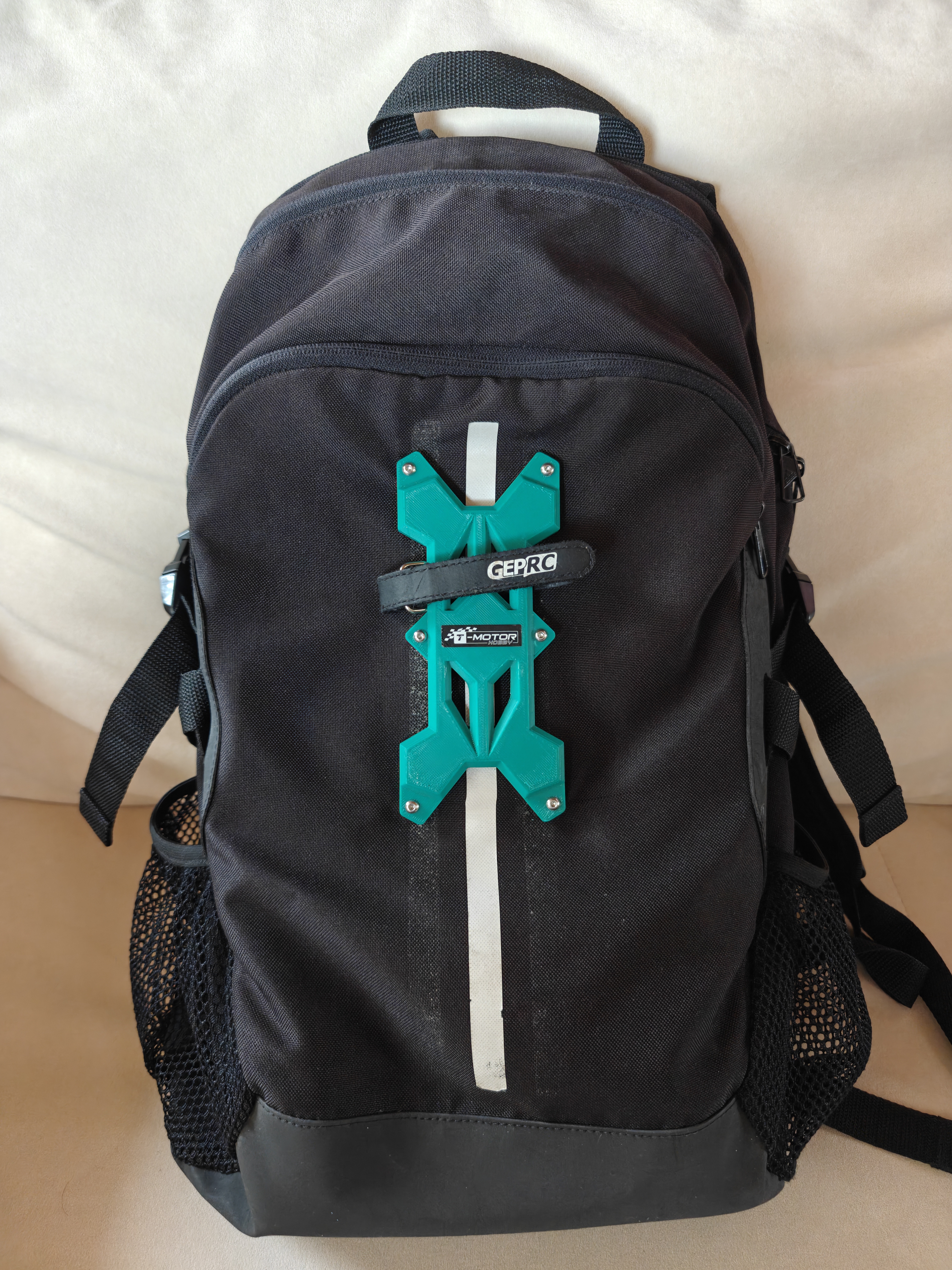 我设计的一套定制的卡扣绑带系统,可安装在背包外部。它能将无人机牢固地固定在包外,从而为背包内部腾出更多空间来存放电池和工具。