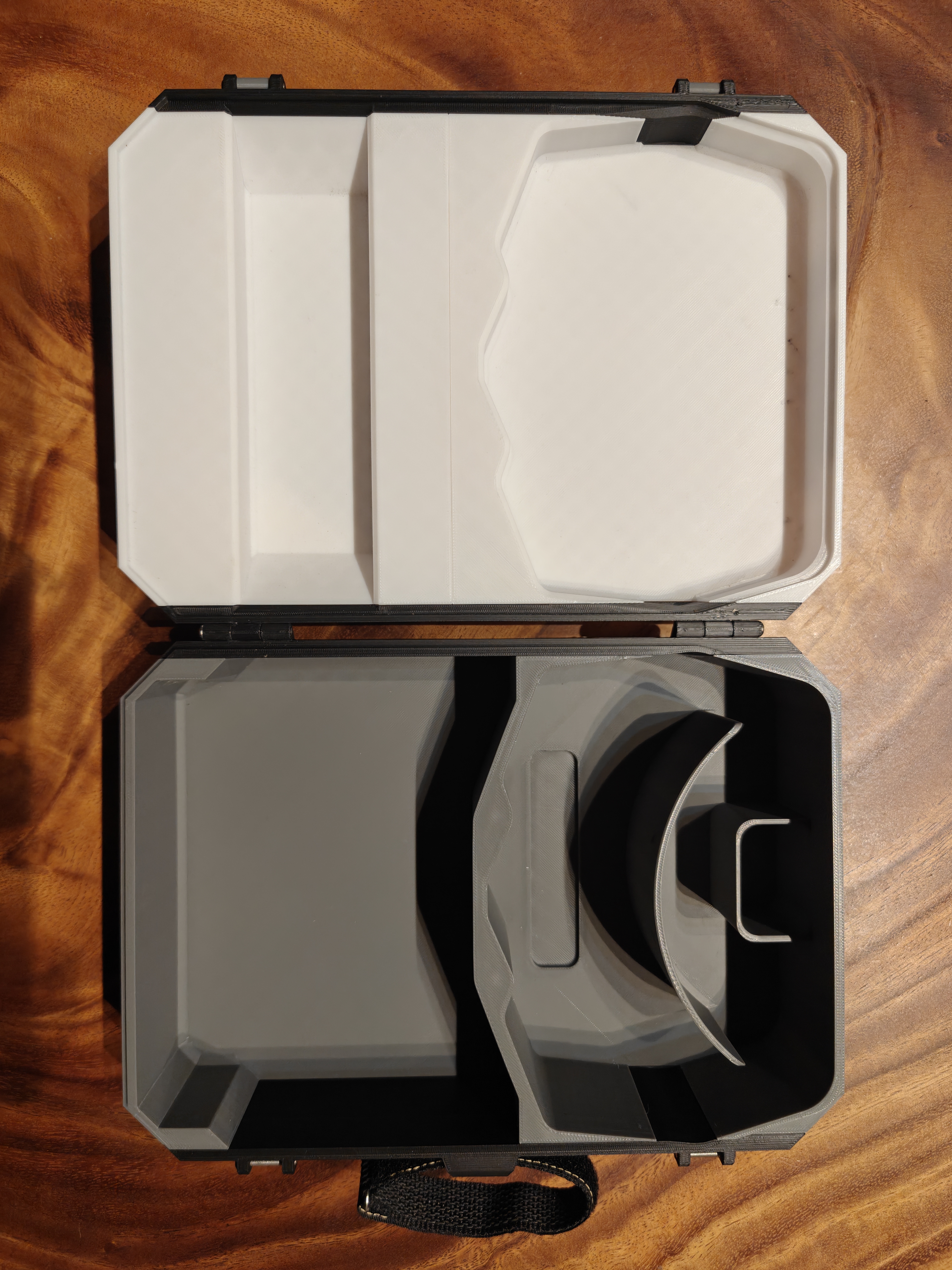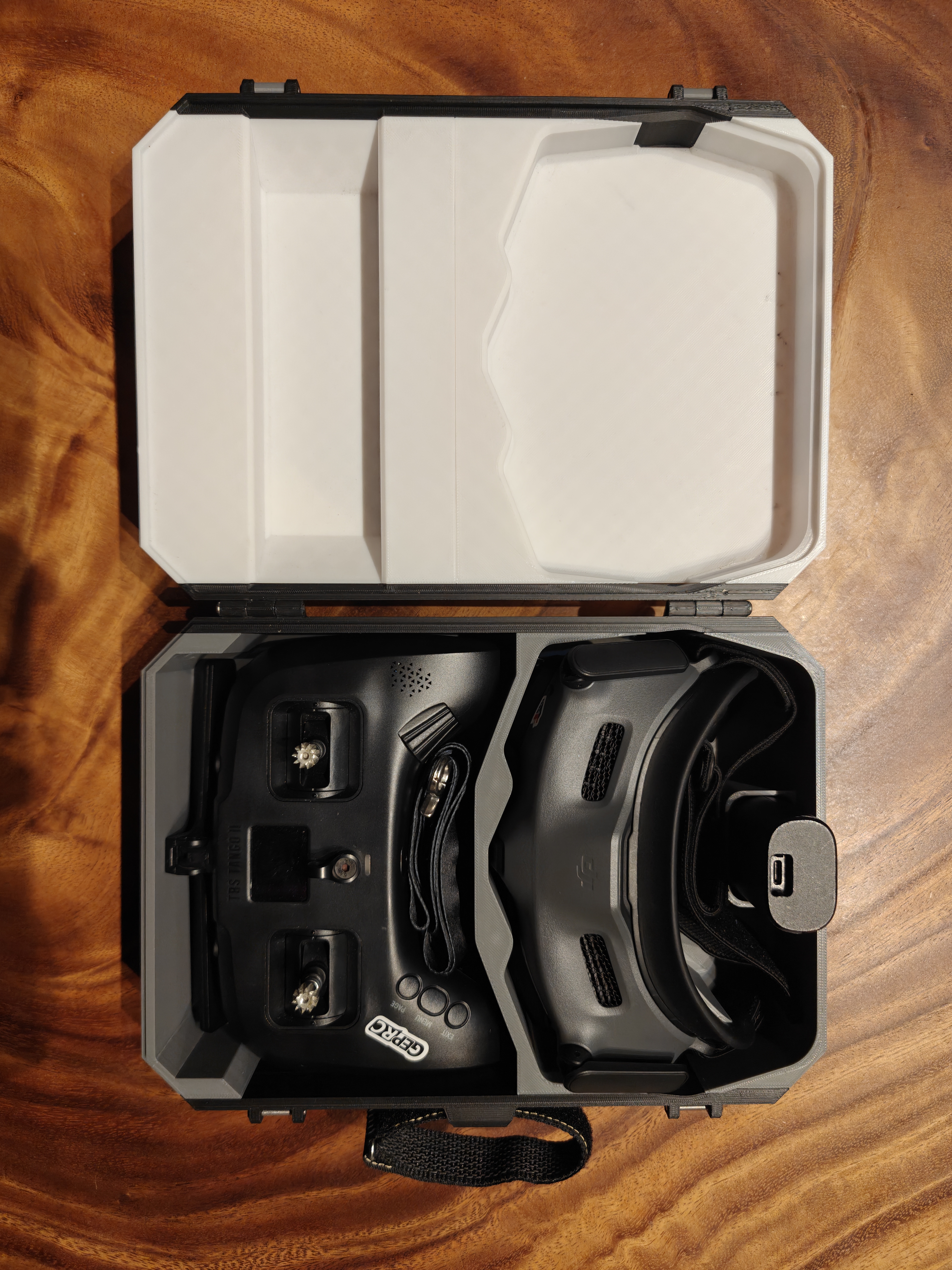 这是一个专为我的 FPV 飞行眼镜和遥控器尺寸定制的硬质收纳盒。可有效防止设备在携带与运输过程中相互刮擦。